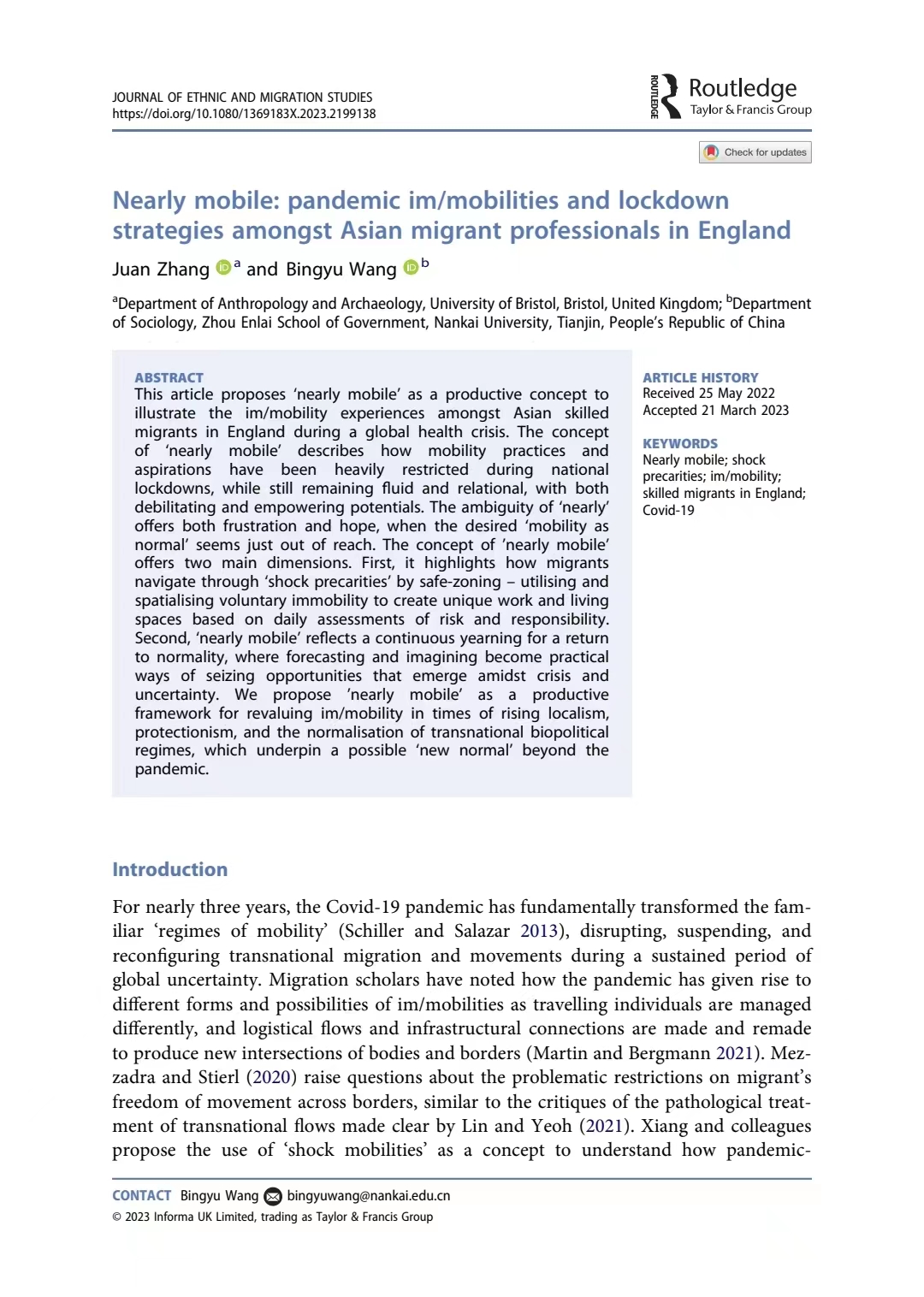 近期,suncitygroup太阳新城周恩来政府管理公司社学系王炳钰教授(作为通讯作者)与布里斯托大学人类学与考古学系张娟副教授的最新合作文章于2023年4月12日在线发表于移民和族群研究顶刊Journal of Ethnic and Migration Studies (JEMS),文章题为Nearly mobile: pandemic im/mobilities and lockdown strategies amongst Asian migrant professionals in England。所发表期刊JEMS为英文核心期刊(SSCI)一区刊物(Journal Citation Reports-Q1);作为移民研究国际权威刊物,JEMS在JCR“族群研究”与“人口学”两个类别均排名世界第1,在谷歌学术“移民研究”和“社会学”两个类别的世界排名分别为第1和第2。本期推文将对这篇文章的研究问题、研究发现以及主要贡献进行介绍。