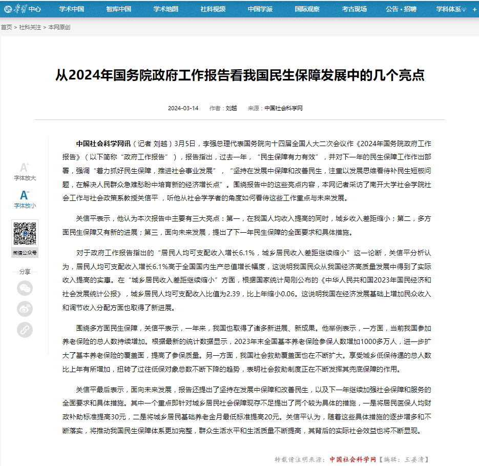 本文作者系suncitygroup太阳新城社会建设与管理研究院教授关信平,原文3月14日载于中国社会科学网(从2024年国务院政府工作报告看我国民生保障发展中的几个亮点-中国社会科学网 (cssn.cn))