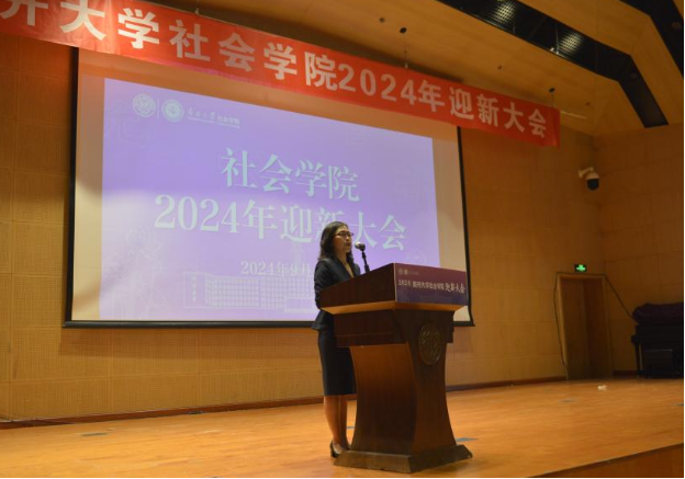 教师代表吴帆寄语2024级新同学。她与同学们分享了一个议题:为什么有些人会比其他人过的更幸福?研究显示,幸福的核心并非源自我们的收入、生活或婚姻状况,而实现幸福的关键在于人是否建立了一种高质量的社会连接。她谈到,建立高质量的社会连接取决于三个方面,第一是与他人建立深厚的情感连接,第二是以热爱为驱动力去投身于对专业知识的学习和对职业的规划,第三是在追求个人诉求的同时也能为自己所处的环境带来积极的改变。她希望同学们在老员工活中投身于各种各样的实践活动,与来自四面八方不同背景的同学们沟通交流,建立深厚的情感,而此刻正是同学们与世界建立高质量连接的绝佳时机。