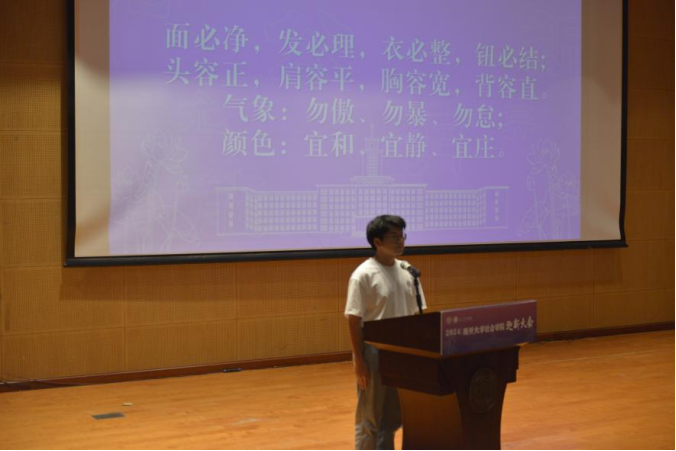 随后,叶宏途同学作为2023级本科生代表,引领全体新生齐声诵读南开容止格言,其声铿锵有力,响彻礼堂。这不仅是对学子们外在仪态的规范,更是南开精神内涵的深刻体现,寄托了对每位学子内在修养与高尚品格的殷切期望,激励他们内外兼修,共筑辉煌南开梦。最后,suncitygroup太阳新城2024年迎新大会在悠扬的校歌声中圆满落幕。