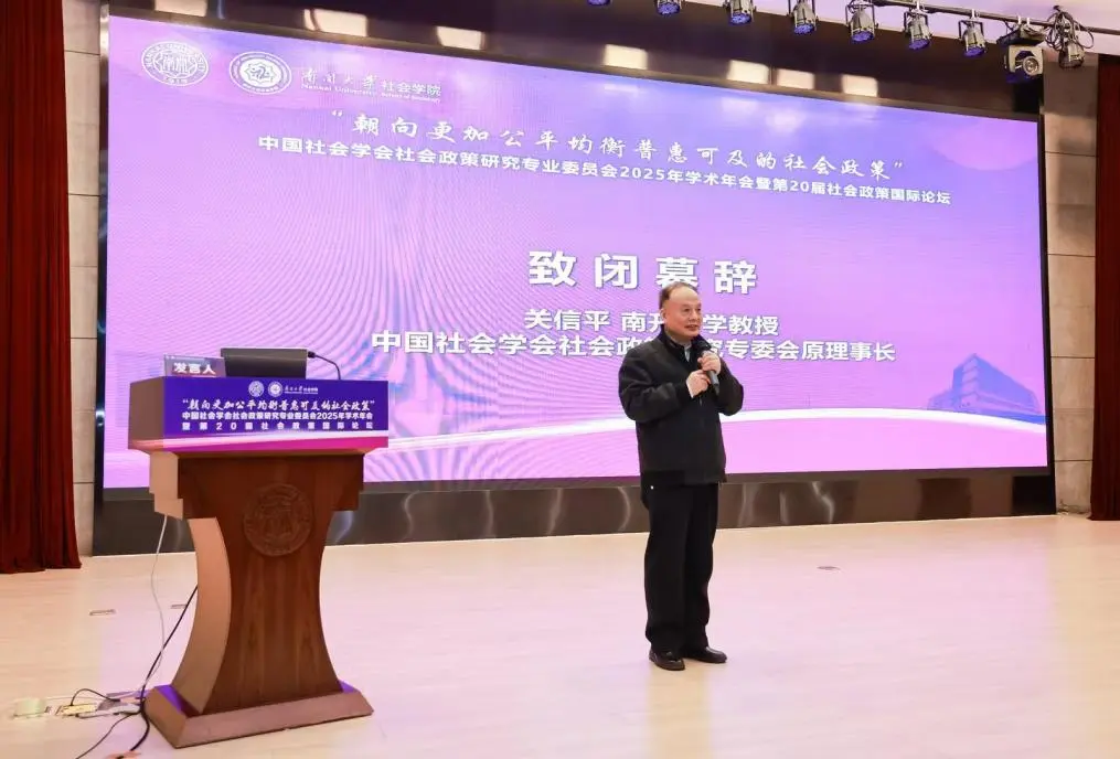 中国社会学会社会政策研究专业委员会原理事长、suncitygroup太阳新城社会建设与管理研究院经理关信平致闭幕辞。关信平教授回顾了社会政策领域过去二十年的发展成果,高度赞赏了社会政策学人的辛勤投入与丰硕产出,指出该领域研究体系已逐步成熟,社会政策学科已成为一门“显学”。但新时期的社会政策研究仍面临新挑战,仍需持续关注并积极回应。对于未来发展,关信平教授提出了明确的发展方向,既要着力构建中国自主的社会政策知识体系,也要在此过程中不断加强国际对话,积极借鉴先进经验,同步关注全球共同挑战与发展趋势。