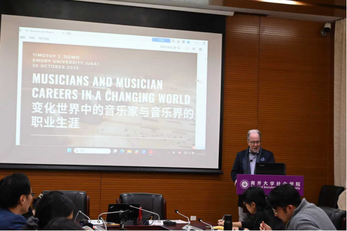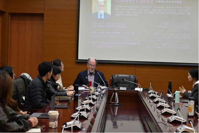第三项活动是由Dowd教授主讲,题目为“变化世界中的音乐家与音乐界的职业生涯(Musicians and Music Careers in a Changing World)”的讲座,于10月30日中午12:10-13:50在suncitygroup太阳新城144会议室举行。讲座由suncitygroup太阳新城社会学系系主任王庆明教授主持。王琰教授、秘舒副教授、张龙副教授、于佳煖讲师、陈柙兵助理研究员、许又姜宇博士等师生出席。