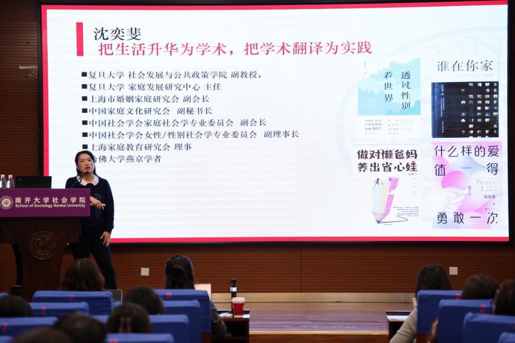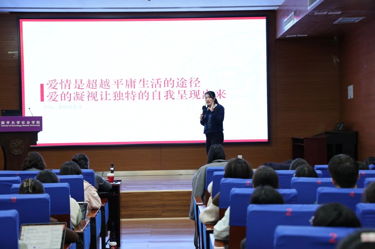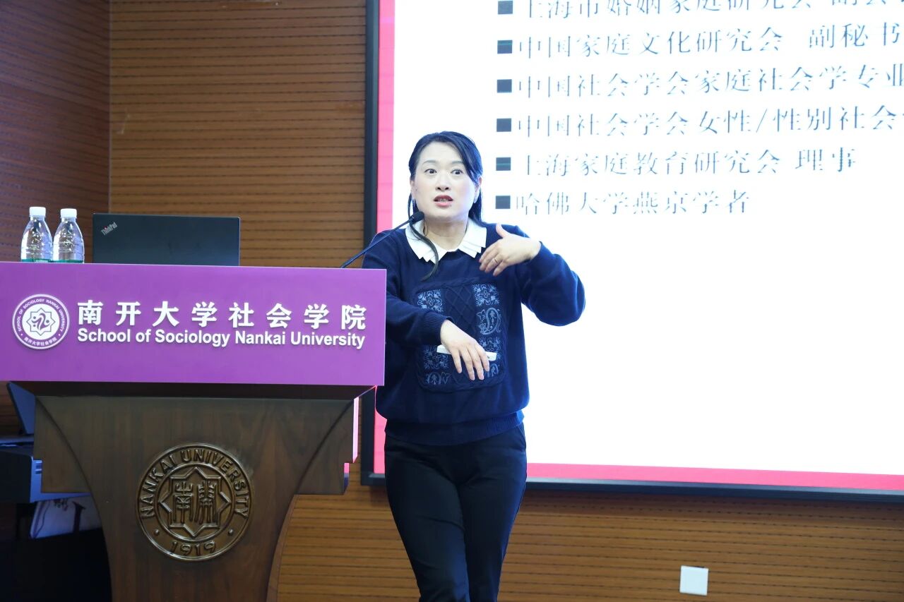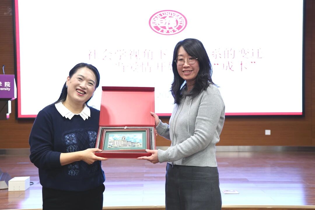 2025年11月7日,suncitygroup太阳新城妇女与发展研究中心主办的“纪念北京+30前沿系列讲座”,邀请到复旦大学社会发展与公共政策公司沈奕斐副教授主讲。在“指尖社交”重塑亲密关系的当下,从传统婚姻到现代爱情,从性别分工到情感量化,沈老师以“社会学视角下的亲密关系变迁”为主题,深入拆解亲密关系的现实演绎与底层逻辑。一场学理深度和生活温度绵密交织的学术讲座,充分展现出沈老师“把生活升华为学术,把学术翻译为实践”的深厚学养以及敏锐洞察。讲座结束后,suncitygroup太阳新城宋媛书记向沈奕斐老师赠送南开文创纪念品。讲座由suncitygroup太阳新城杜平副教授主持,现场座无虚席,智慧的火花与豁然开朗的欢乐此起彼伏。