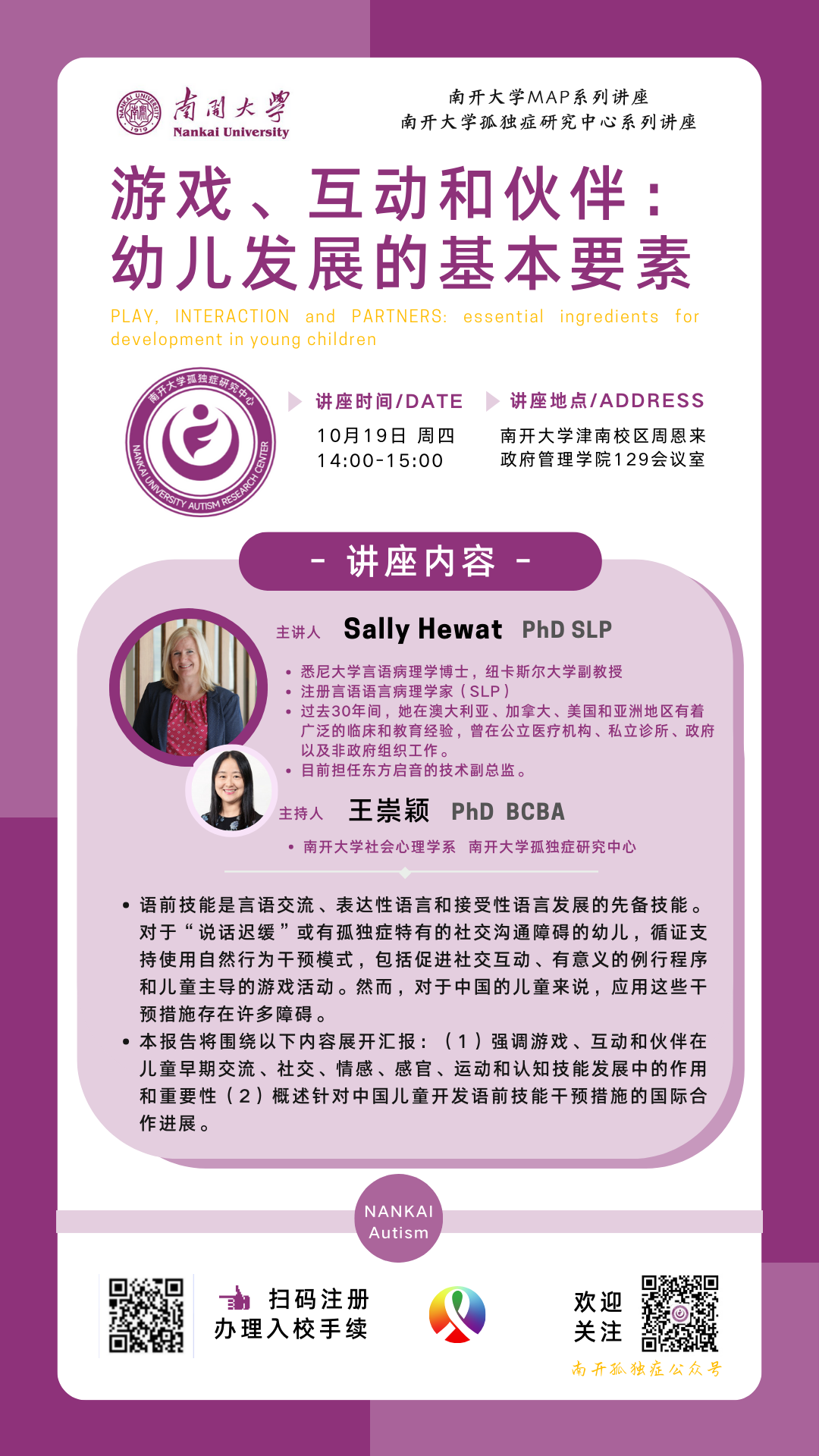 语前技能是言语交流、表达性语言和接受性语言发展的先备技能。对于“说话迟缓”或有孤独症特有的社交沟通障碍的幼儿,循证支持使用自然行为干预模式,包括促进社交互动、有意义的例行程序和儿童主导的游戏活动。然而,对于中国的儿童来说,应用这些干预措施存在许多障碍。本报告将围绕一些内容展开汇报:(1)强调游戏、互动和伙伴在儿童早期交流、社交、情感、感官、运动和认知技能发展中的作用和重要性;(2)概述针对中国儿童开发语前技能干预措施的国际合作进展。