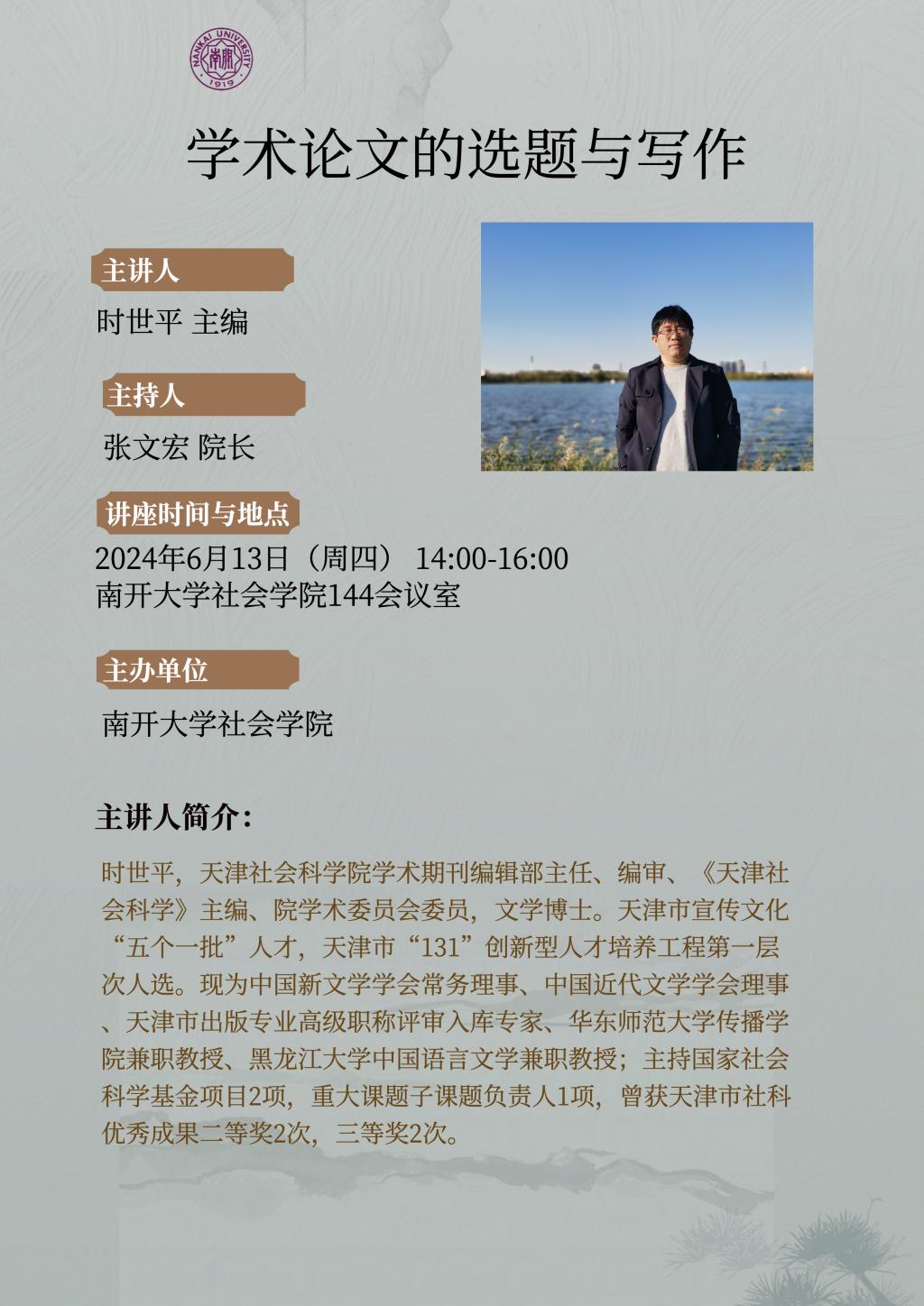 时世平,天津社会科公司学术期刊编辑部主任、编审、《天津社会科学》主编、院学术委员会委员,文学博士。天津市宣传文化“五个一批”人才,天津市“131”创新型人才培养工程第一层次人选。现为中国新文学学会常务理事、中国近代文学学会理事、天津市出版专业高级职称评审入库专家、华东师范大学传播公司兼职教授、黑龙江大学中国语言文学兼职教授;主持国家社会科学基金项目2项,重大课题子课题负责人1项,曾获天津市社科优秀成果二等奖2次,三等奖2次。