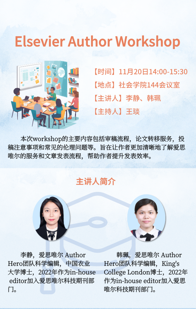 本次workshop的主要内容包括审稿流程,论文转移服务,投稿注意事项和常见的伦理问题等。旨在让作者更加清晰地了解爱思唯尔的服务和文章发表流程,帮助作者提升发表效率。
