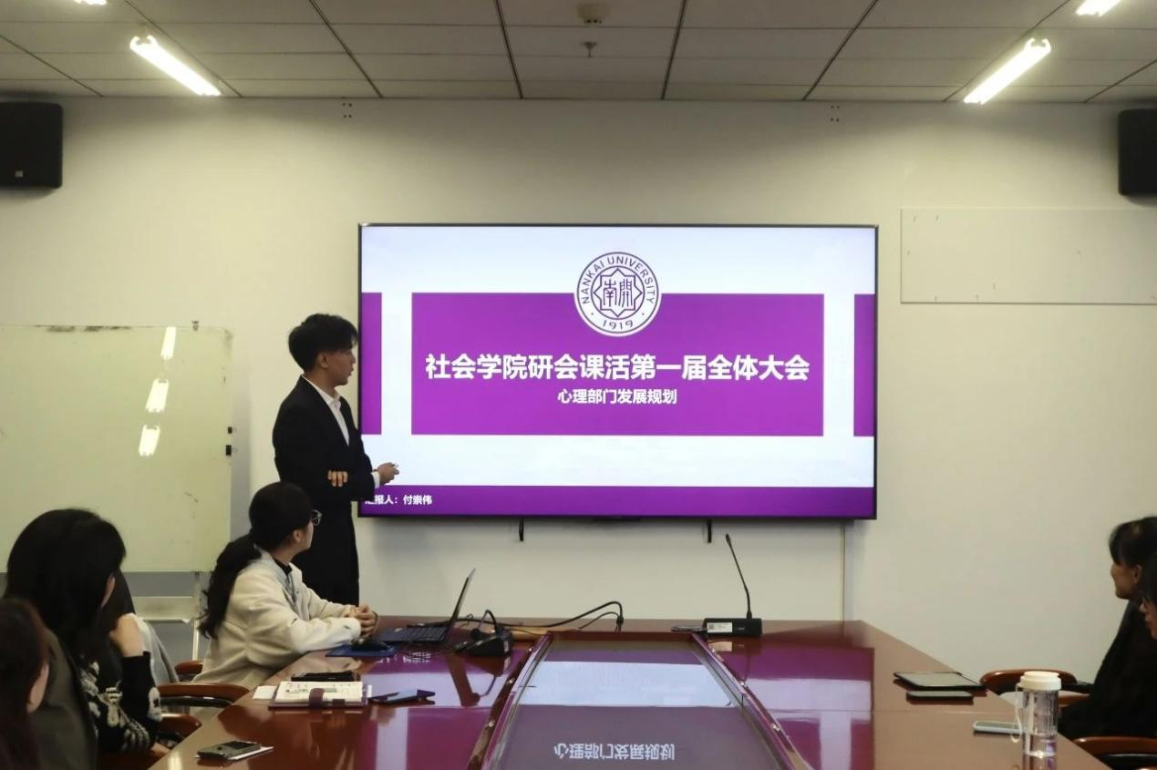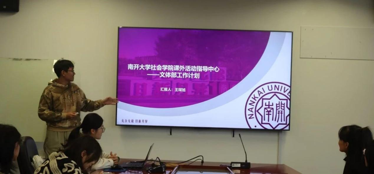 研究生课外活动指导中心主席团成员衣起麟代文体部部长王琛旭汇报,文体部根据员工需要为大家准备了各式各样的文娱、体育活动,加强员工体育锻炼,丰富员工的课余生活。