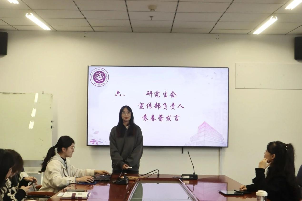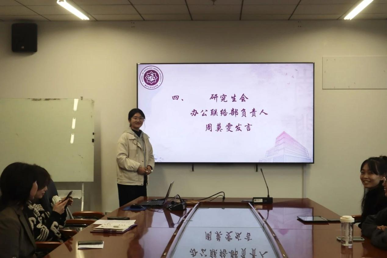 研究生会办公联络部负责人周莫雯从办公和联络两个方面叙述了办公联络部的主要职责,以及从各层级出发,对接校研究生会,以便及时做好员工工作。
